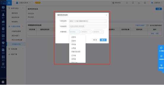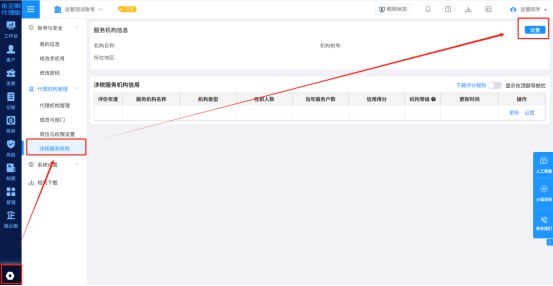 使用管理员账号登录,点击左下角设置按钮,选择【涉税服务机构】,点击右上角【设置】■■★◆◆■,在弹窗中输入好机构名称、税号以及所属地区