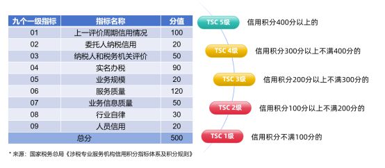 TSC(Tax Service Credit)是涉税专业服务机构信用等级的英文缩写。涉税专业服务机构的信用评价采取信用积分+信用等级结合的方式★★◆★◆◆。按照从高到低顺序分为五级,分别是TSC5级■■★◆★、TSC4级、TSC3级、TSC2级和TSC1级◆◆★■,满分为500分。税务机关会对不同信用评价级别的涉税专业服务机构采取分级分类的管理服务措施。